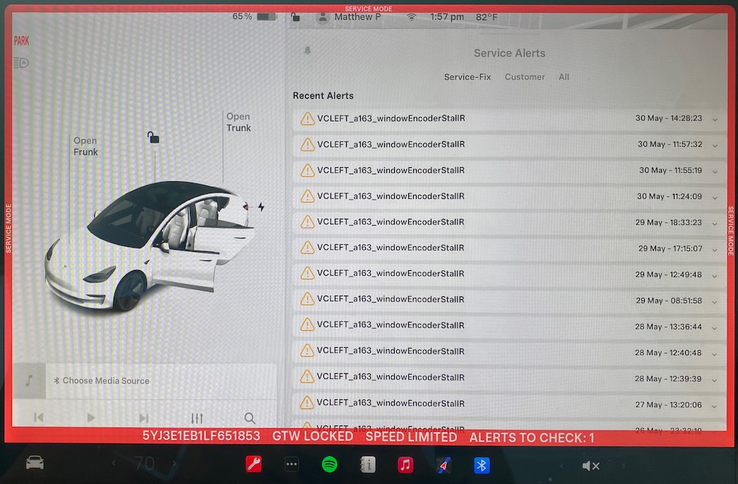 First, you need to put the car into service mode. To do that, tap on the car in the bottom left, then software, then you need to press and hold on the Model 3 for about five seconds. Then the access code is “service”. Pressing enter will bring us into service mode. There’s a bunch of cool diagnostics in here but… explore it responsibly. If you tap on service alerts, you can see what your car is unhappy about. My car is unhappy about the rear left window encoder, which makes sense. And apparently it’s been unhappy about that for the last month, but the warnings I guess were never strong enough to be viewable outside of service mode. But, if you see these VCLEFT_a163_windowEncoderStallR warnings, you’re probably going to have to replace the assembly.