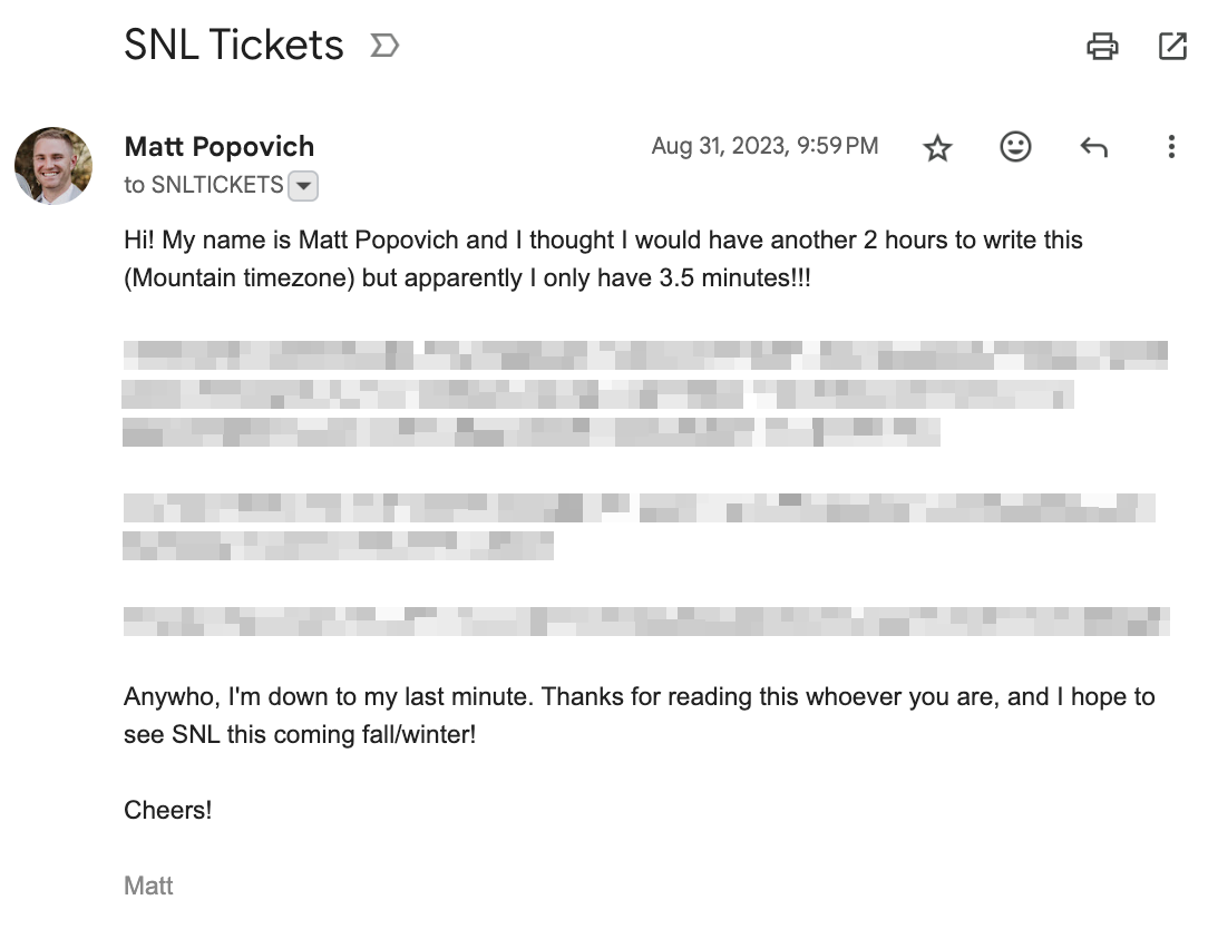 This year, I found out that SNL tickets are free!! All you have to do is apply for them and win their lottery! Applying for tickets is done by sending an email during the month of August. The main thing they ask is you include “why you would like to be a part of SNL’s studio audience”, which I imagine is a main part of the selection process.